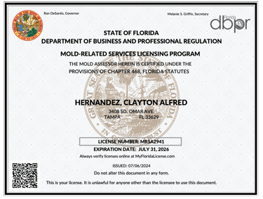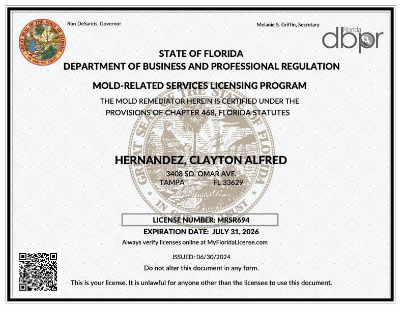 Decontech is certified to provide mold inspection services to both homes and businesses in the State of Florida